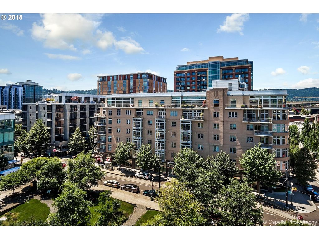 Spectacular floor plan-main living area has newly refinished Birch floors, gas fireplace, deck and eating bar and designated dining area,Lush green trees create serene environment, privacy and lovely view at Bridgeport condos on Tanner Springs Park Master suite overlooks quiet courtyard. Guest room on opposite end of unit with murphy bed and walk-in closet. New paint/carpet.