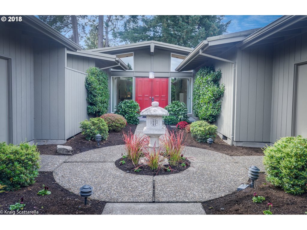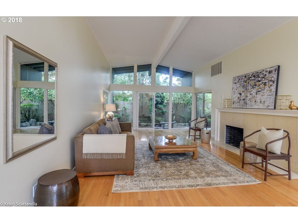 Rummer inspired mid-century modern main level home located in Vista Hills. Gated front courtyard leads to spacious, light & open, stunning living room with vaulted ceilings, fireplace. Sliding doors in all rooms to private beautiful landscaped yard. Two bedrooms, two full baths. Kitchen, dining with family room w fireplace to covered large patio in backyard. Large utility room with space for office or extra room.