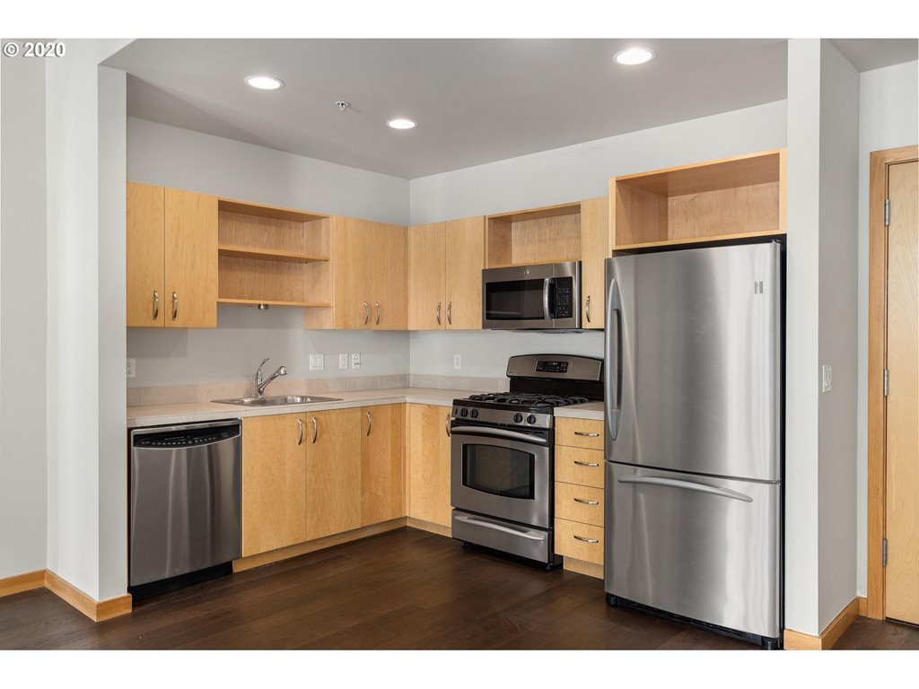 View of Willamette River at Pinnacle Condos. NEW UPGRADES- new oak wood floors in main living area and new textured carpet in beds. Unbeatably efficient floor plan with 2 bed/2 bath and lovely balcony perched over the neighborhood with view of The Fields Park and river. Excellent separation of space. Enjoy common area terrace on 7th floor for entertaining. Easy access to river esplanade and all the Pearl has to offer. Parking and storage included in sale.