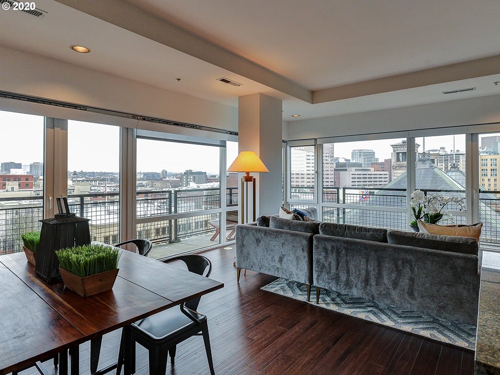 Stunning Unobstructed REAL one bedroom City/Mountain/Bridge Views. Premier 8th floor SE corner unit flooded with natural light year-round. Spacious design w/ high ceilings & beautiful wood floors. Window walls + wrap around balcony. The southern view is accentuated in the Master bedroom at night framing a dazzling display of city lights. Close to bus, max, shops & dining options. Deeded parking. HOA pays utilities except electric.