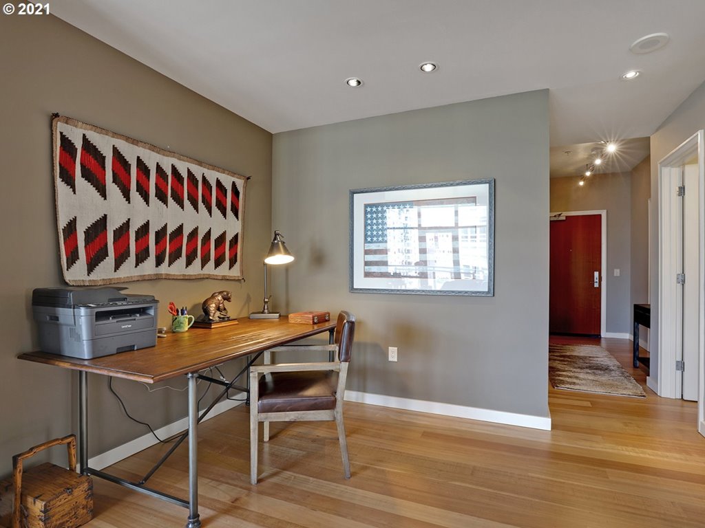 The exclusive Henry building – uniquely remodeled northeast corner unit with floor to ceiling windows showcasing views of the Pearl District & Forest Park. This 1 bedroom plus den condo has been completely customized. Featuring a new kitchen with quartz countertops, custom backsplash, new cabinets with soft close touch, modern built-ins throughout and refinished wood floors. Enjoy the spacious patio with protected views! LEED Gold certified & WalkScore of 98.