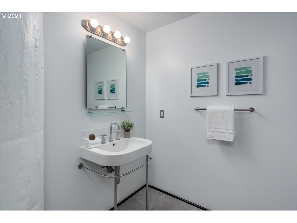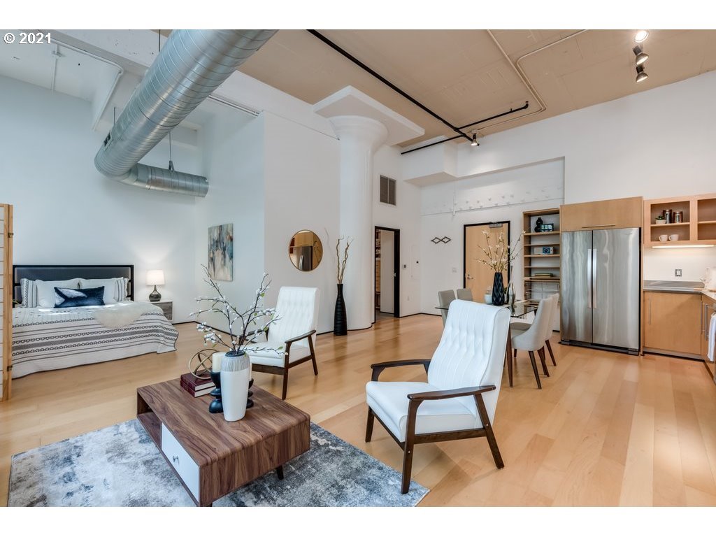 Modern-Industrial Light-filled Condo #110 in Avenue Lofts. Recognized as one of the best in the Pearl District, w/12+ft high ceilings, Maple hardwood floors & cabinets, SS appliances & counters, remodeled shower, concrete walls making it extremely quiet inside, large windows above street level, A/C. Large bedroom area off to side can be divided for privacy & fits California King bed. Sunny atrium, gym, restaurants, grocery, theater, bars, boutiques & Powells bookstore near! Deeded parking #203