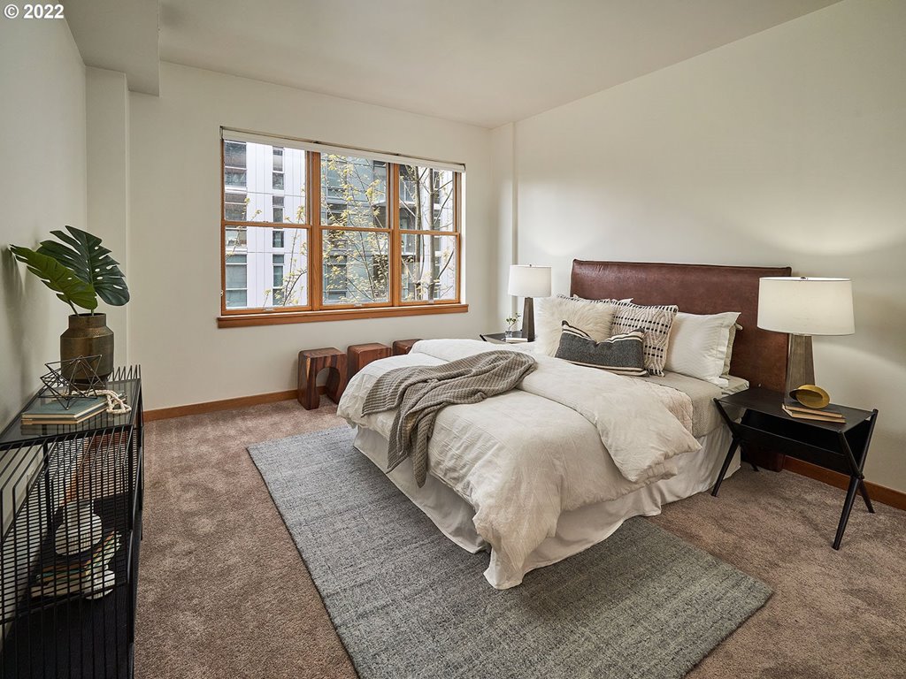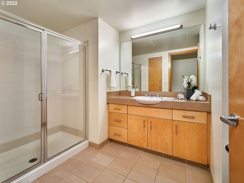 Fantastic, light Riverstone corner 2 bedroom in the heart of the Pearl. Enjoy serene treetop & city views. Great floor plan w/ open main living area & private bedrooms. Features & attributes: entryway w/ closet, spacious kitchen w/ newer appliances & eat bar, newer HVAC, darling balcony, gas firepl. updated blinds, newer carpet, ample walk-in closets, signature wood windows. Parking & storage.