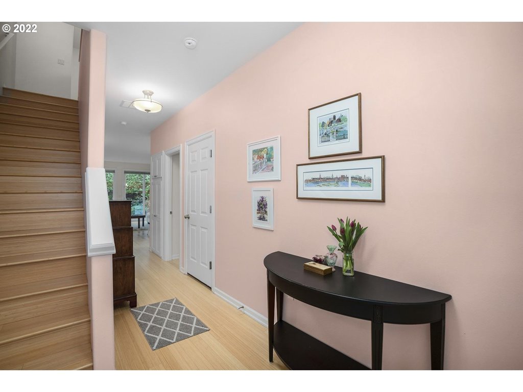 Two Suite Townhouse perfectly situated between Multnomah Village, Hillsdale & Gabriel Park. Beautifully maintained w/bamboo floors, high ceilings, gas fireplace, good light, deck & paver patio. Island kitchen has gas range & eating bar. Half bath on main. 2 spacious bedroom suites up both have walk-in closets & new blinds. New light fixtures in great room & bedrooms. Laundry w/washer & dryer incl. Lots of storage space. Central A/C. Low HOA dues. Easy commute to downtown, OHSU or Lewis & Clark. [Home Energy Score = 8. HES Report at rpt.greenbuildingregistry.com/hes/OR10198285]