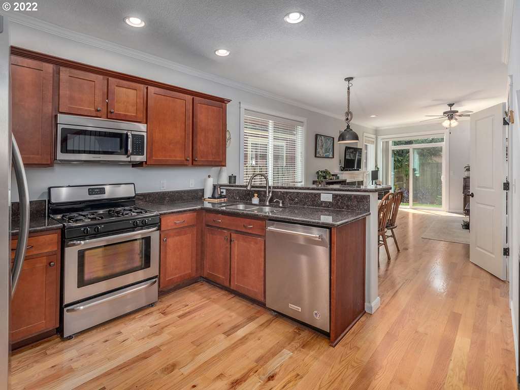 Enjoy the many features of this beautiful home with an open great room, tall ceilings, hardwood floors, a gas fireplace and air conditioning. Kitchen includes an eating bar, gas range, SS appliances, granite counter tops and wine fridge. Dining space provides additional seating and sliding doors open to an outdoor patio and fenced yard. Upstairs primary suite has custom California Closet organization and vaulted ceilings. Laundry room is conveniently located upstairs. All appliances included. [Home Energy Score = 8. HES Report at rpt.greenbuildingregistry.com/hes/OR10201468]