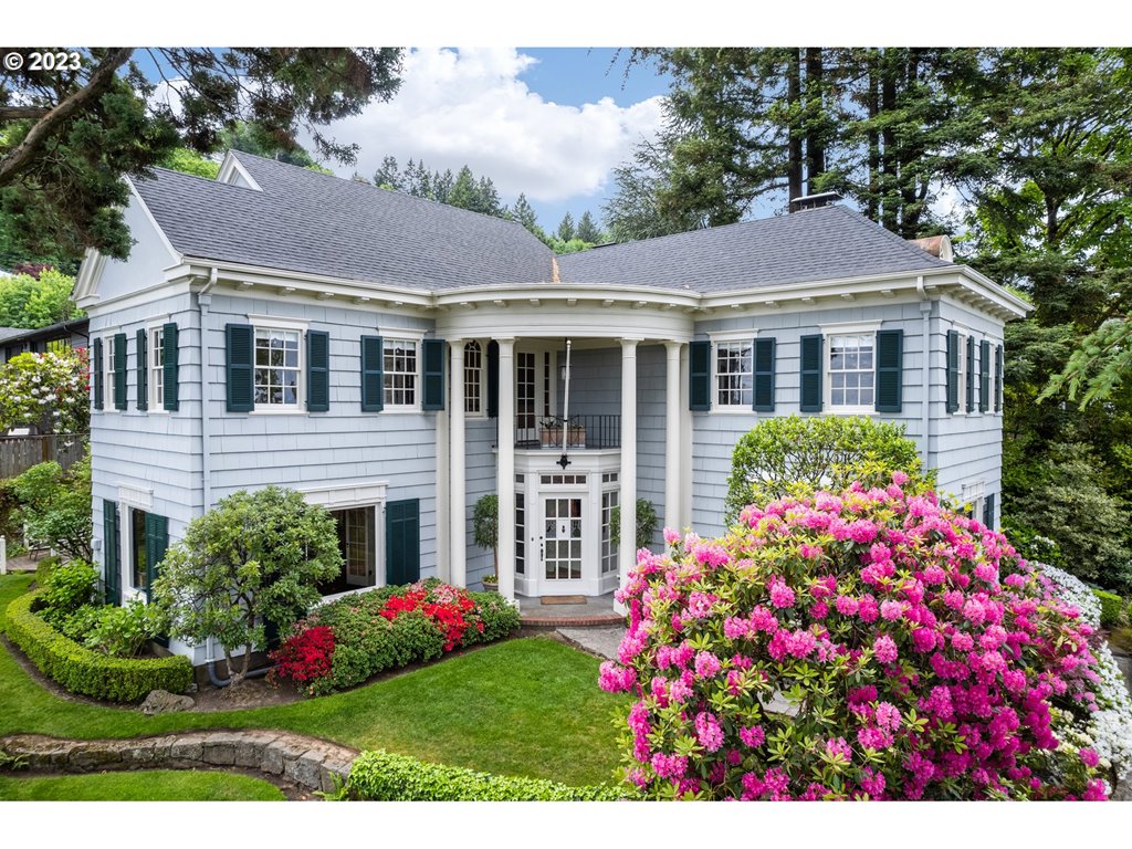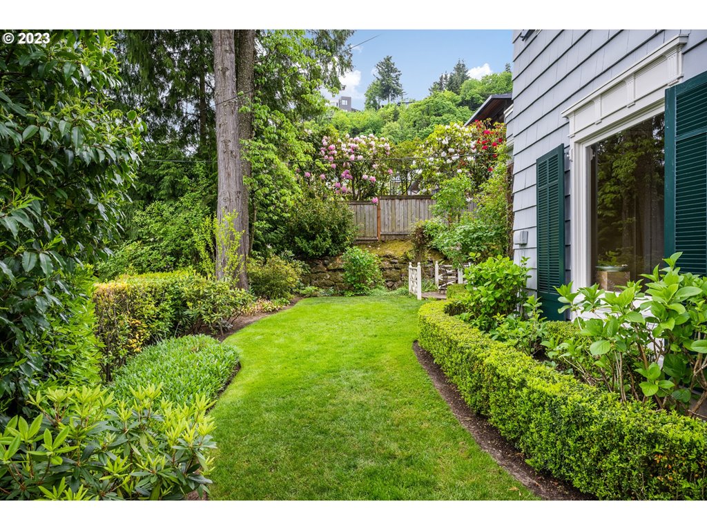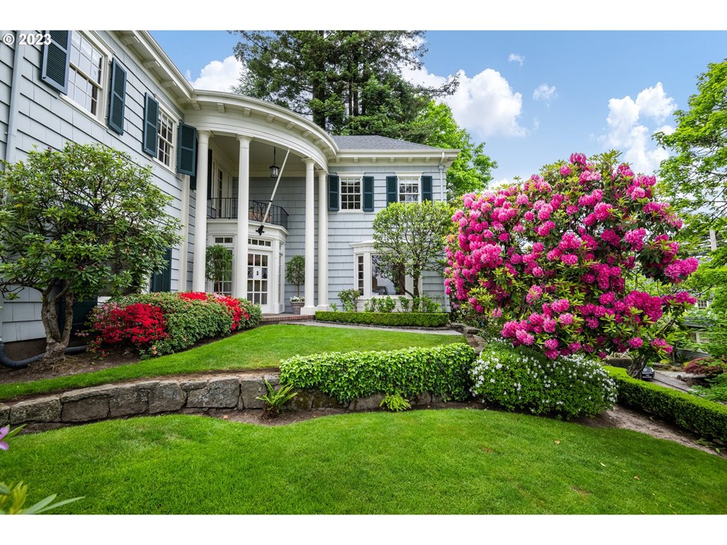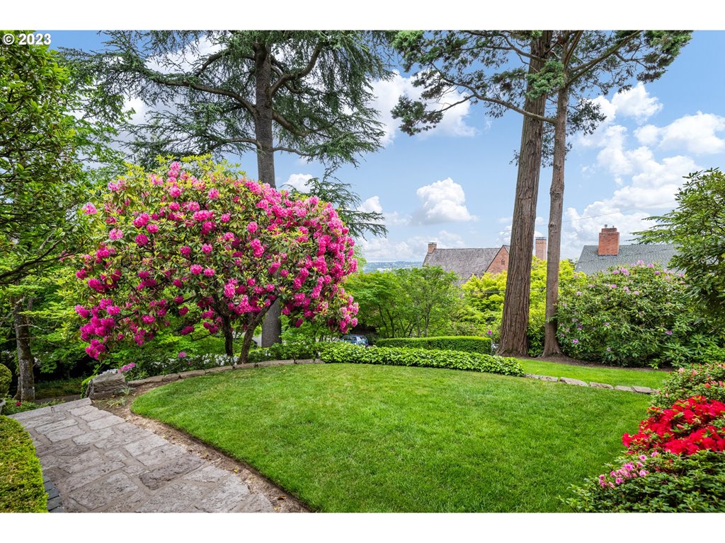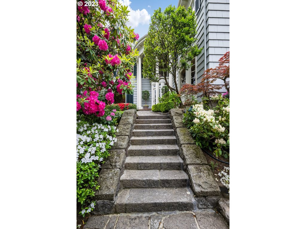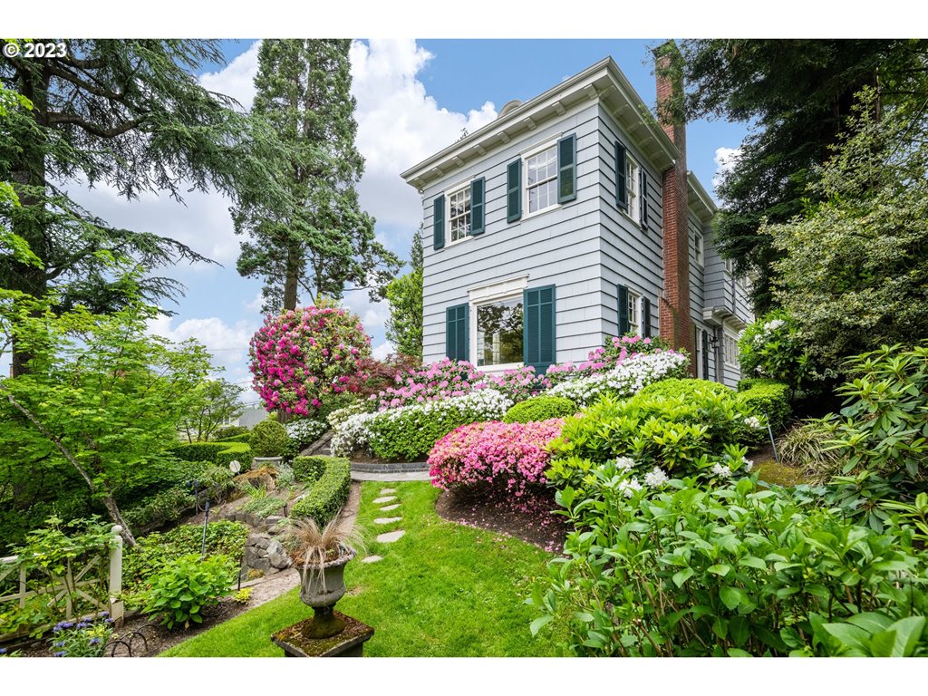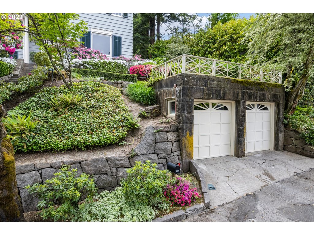 This home has an impressive architectural pedigree: originally designed by commercial Architects DeYoung and Roald (Historic Heathman Hotel) for prominent Civic Engineer G.L. Rauch. Later prestigious Architect Richard Sundeleaf did kitchen & family room expansion with Douglas fir hand-hewn timbers. The home has been masterfully updated with timeless finishes and is surrounded by incredible gardens. Incredible public rooms are adorned with multi-pane and French doors. Paneled walls meet picture rail millwork and original built-ins and architectural details are highlighted by natural light streaming in the windows. The home has been enhanced to ensure the original architectural charm was retained. The kitchen, with slab Cararra marble counters, is connected to the family room which opens to an brick patio. Luxurious primary en suite bathroomis finished with captivating Honey Onyx. Windows frame outlooks of Mt Hood, Mt Adams, Willamette River the City, plus mutiple gardens and patios. Master stone & tile mason from England created pathways complementing the existing stone walls- which were built by the same stone mason as the Vista House in the Columbia River Gorge. Lush lawns are bordered by blooming shrubs and majestic trees. The home is elevated above the street ensuring privacy, serenity and an abundance of natural light. Rare original two car garage attached with tunnel and convenient staircase to the basement and kitchen. Located one street away from Forest Park trails at the end of NW Cumberland. [Home Energy Score = 1. HES Report at rpt.greenbuildingregistry.com/hes/OR10219465]