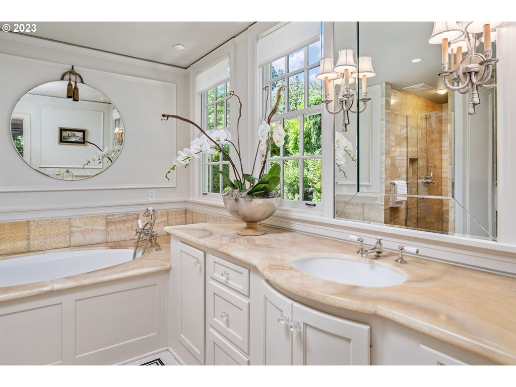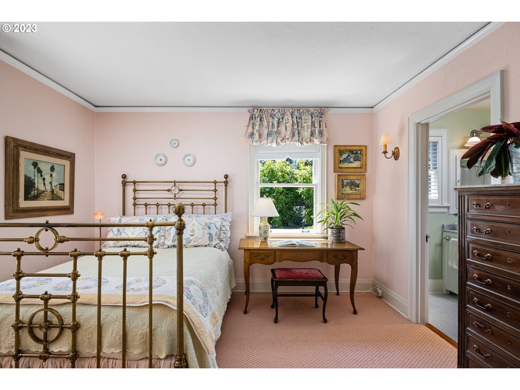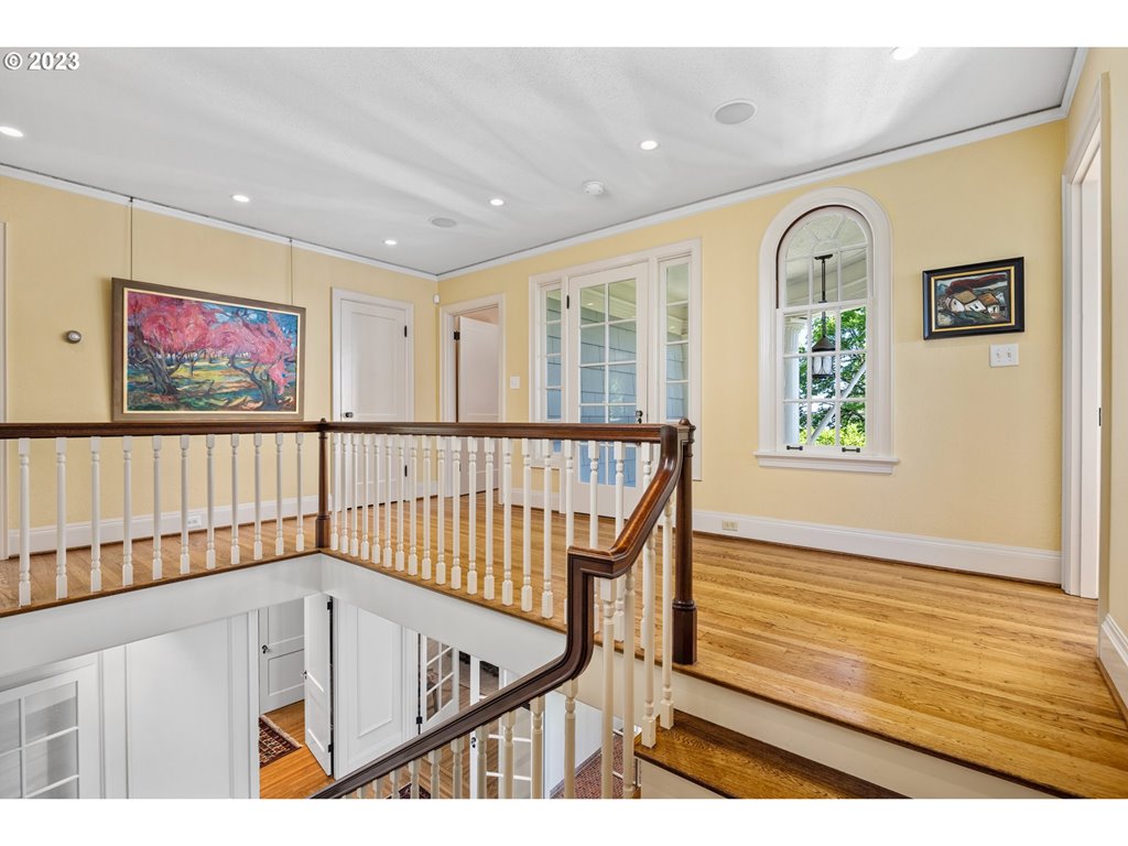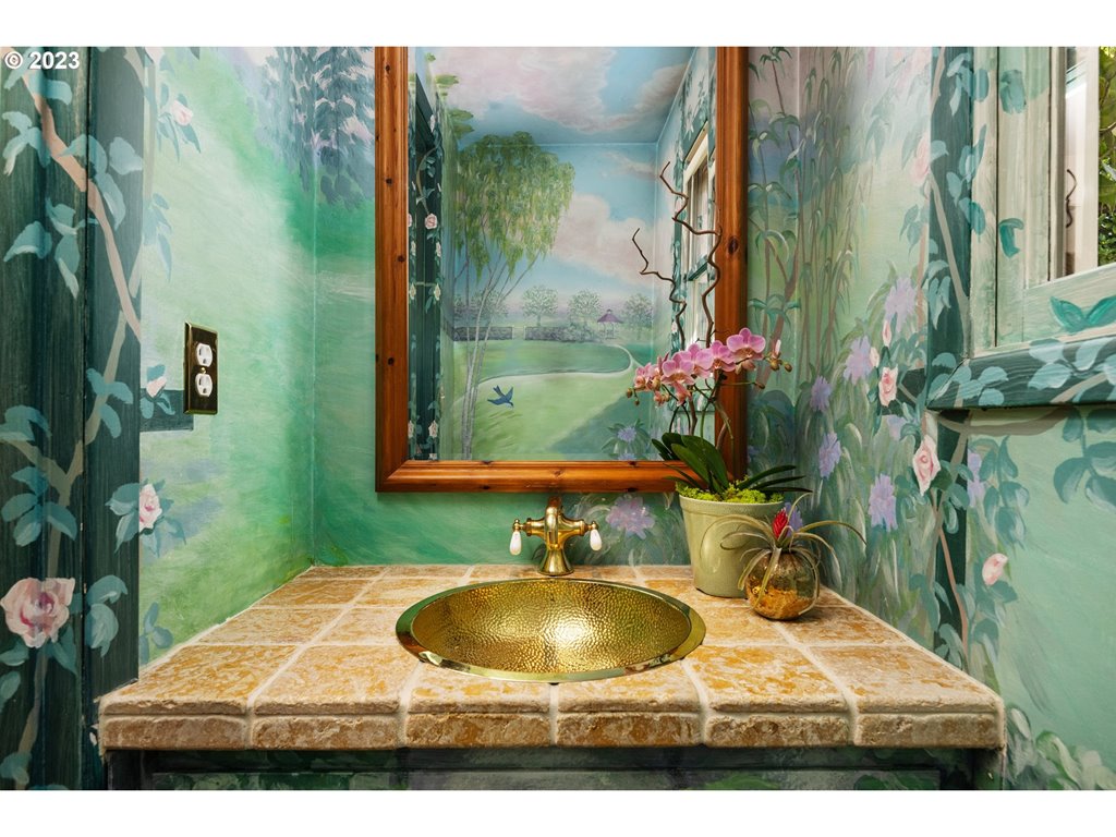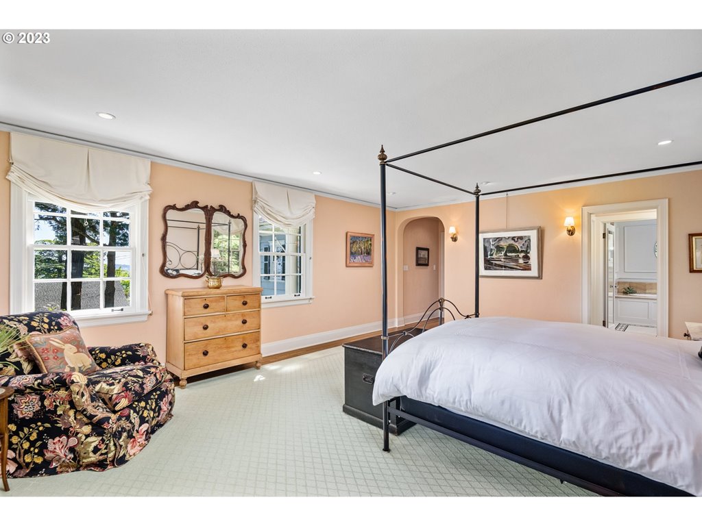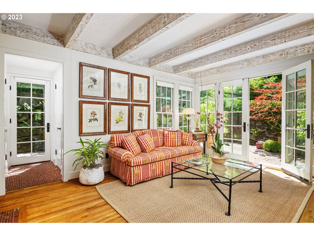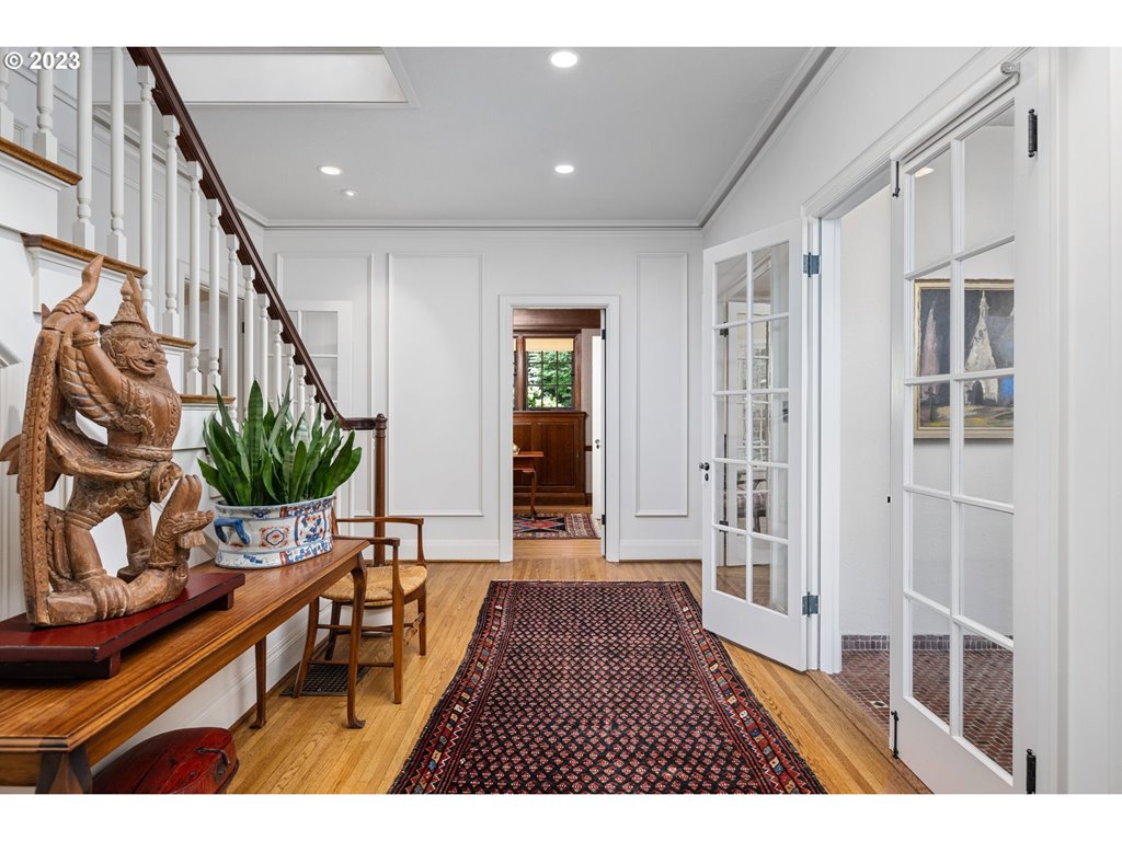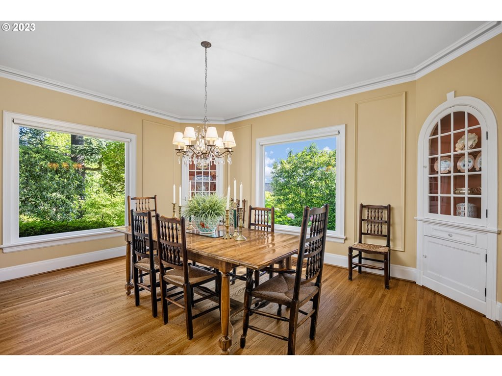 This home has an impressive architectural pedigree: originally designed by commercial Architects DeYoung and Roald (Historic Heathman Hotel) for prominent Civic Engineer G.L. Rauch. Later prestigious Architect Richard Sundeleaf did kitchen & family room expansion with Douglas fir hand-hewn timbers. The home has been masterfully updated with timeless finishes and is surrounded by incredible gardens. Incredible public rooms are adorned with multi-pane and French doors. Paneled walls meet picture rail millwork and original built-ins and architectural details are highlighted by natural light streaming in the windows. The home has been enhanced to ensure the original architectural charm was retained. The kitchen, with slab Cararra marble counters, is connected to the family room which opens to an brick patio. Luxurious primary en suite bathroomis finished with captivating Honey Onyx. Windows frame outlooks of Mt Hood, Mt Adams, Willamette River the City, plus mutiple gardens and patios. Master stone & tile mason from England created pathways complementing the existing stone walls- which were built by the same stone mason as the Vista House in the Columbia River Gorge. Lush lawns are bordered by blooming shrubs and majestic trees. The home is elevated above the street ensuring privacy, serenity and an abundance of natural light. Rare original two car garage attached with tunnel and convenient staircase to the basement and kitchen. Located one street away from Forest Park trails at the end of NW Cumberland. [Home Energy Score = 1. HES Report at rpt.greenbuildingregistry.com/hes/OR10219465]
