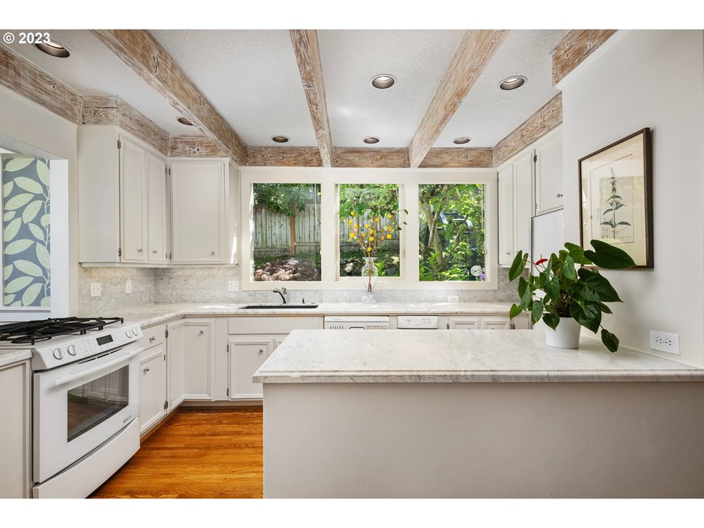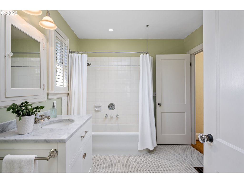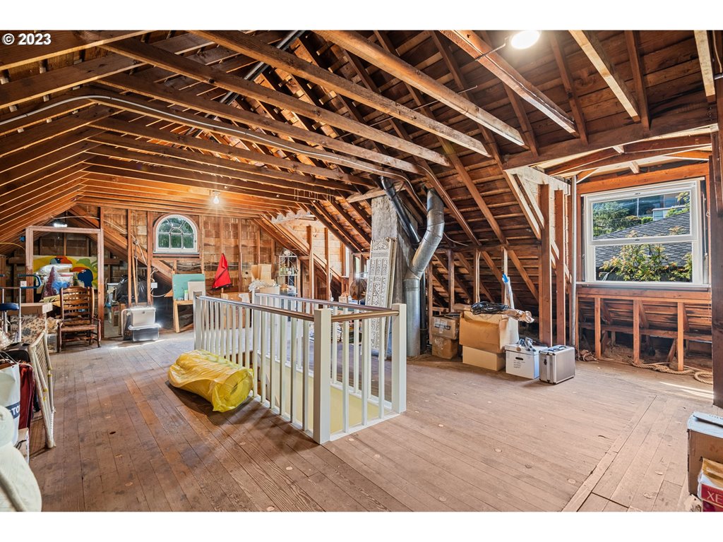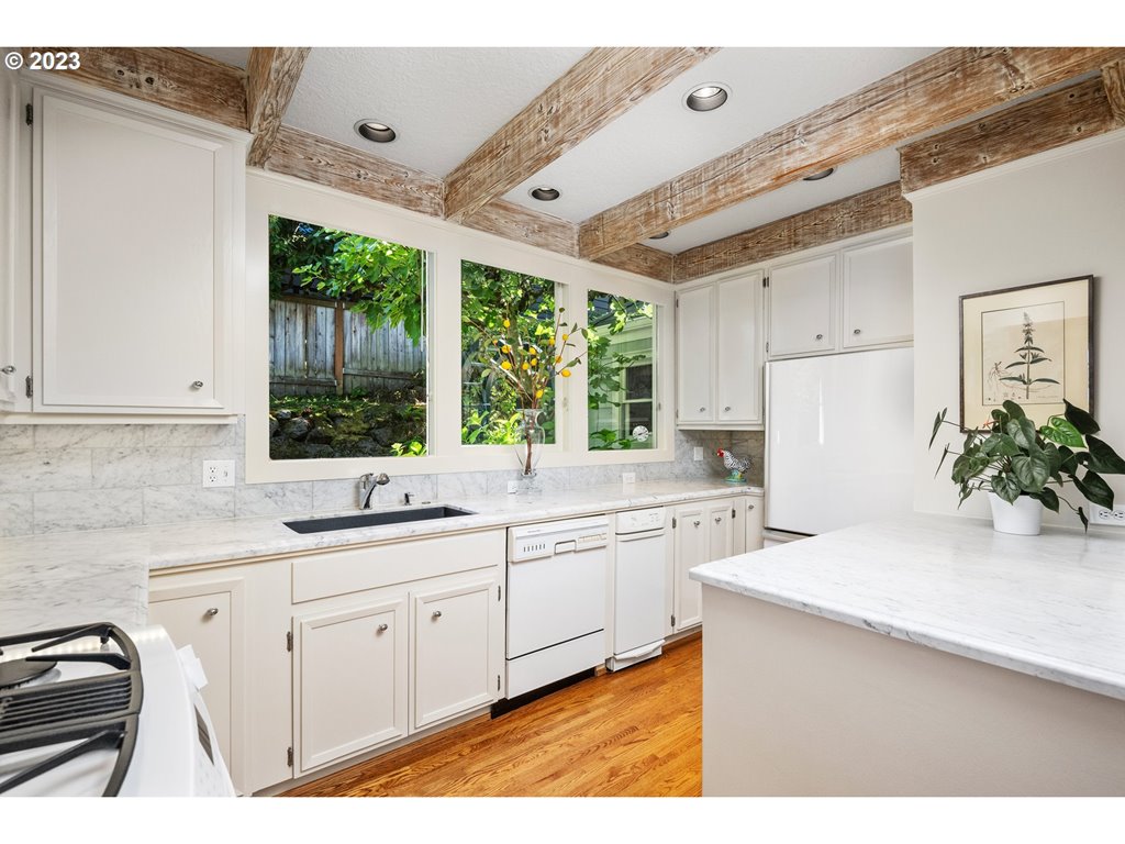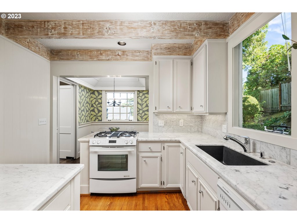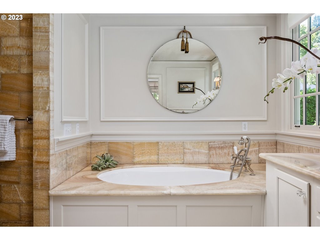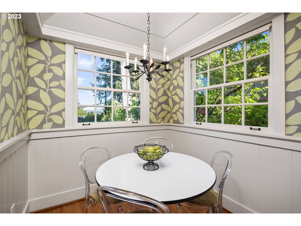 This home has an impressive architectural pedigree: originally designed by commercial Architects DeYoung and Roald (Historic Heathman Hotel) for prominent Civic Engineer G.L. Rauch. Later prestigious Architect Richard Sundeleaf did kitchen & family room expansion with Douglas fir hand-hewn timbers. The home has been masterfully updated with timeless finishes and is surrounded by incredible gardens. Incredible public rooms are adorned with multi-pane and French doors. Paneled walls meet picture rail millwork and original built-ins and architectural details are highlighted by natural light streaming in the windows. The home has been enhanced to ensure the original architectural charm was retained. The kitchen, with slab Cararra marble counters, is connected to the family room which opens to an brick patio. Luxurious primary en suite bathroomis finished with captivating Honey Onyx. Windows frame outlooks of Mt Hood, Mt Adams, Willamette River the City, plus mutiple gardens and patios. Master stone & tile mason from England created pathways complementing the existing stone walls- which were built by the same stone mason as the Vista House in the Columbia River Gorge. Lush lawns are bordered by blooming shrubs and majestic trees. The home is elevated above the street ensuring privacy, serenity and an abundance of natural light. Rare original two car garage attached with tunnel and convenient staircase to the basement and kitchen. Located one street away from Forest Park trails at the end of NW Cumberland. [Home Energy Score = 1. HES Report at rpt.greenbuildingregistry.com/hes/OR10219465]