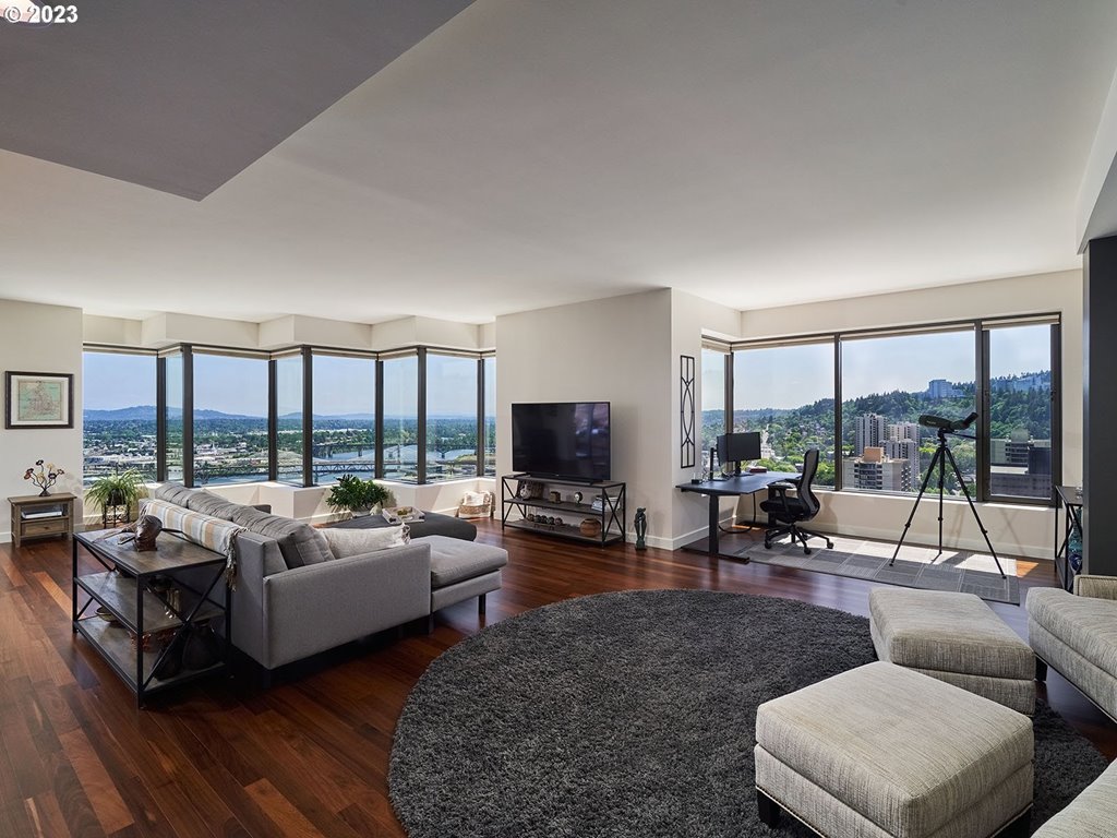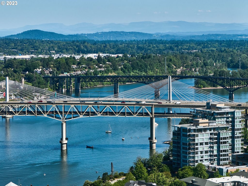 Be inspired by the breathtaking views of the Willamette River, surrounding mountains, and the city skyline that enchants from every angle. Offering versatility and seamless flow throughout, the home has an airy, desirable layout. A recent renovation has enhanced the connectivity between the kitchen and the main living area, amplifying the panoramic vistas. Expansive and light, the living room provides an ideal setup/layout for a home office, complementing the overall spaciousness. Culinary enthusiasts will delight in the chef-grade kitchen, featuring a granite-topped island, top-tier stainless steel appliances, and an effortless use of space. Adjacent to the kitchen, the dining space includes sliding doors leading to a covered balcony, perfect for entertaining or relaxation.The guest bathroom has been exquisitely updated with gleaming quartz countertops, a modern walk-in shower, and stylish finishes. Tucked away for privacy, the primary bedroom suite is a true sanctuary, complete with a spa-like bathroom offering a steam shower, a sumptuous bathtub, two sinks, and a thoughtfully organized walk-in closet with new cabinetry. Additional, thoughtful enhancements by the owner include sophisticated light fixtures, plush carpeting in the bedrooms, fresh paint for walls, baseboards and trim, as well as updated hardware for a refined look. The Fountain Plaza is an iconic building with unparalleled views and an elegant lifestyle. Residents enjoy top-notch security and services, including a concierge, an onsite manager, and a dedicated security guard, along with the convenience of parking and storage facilities.