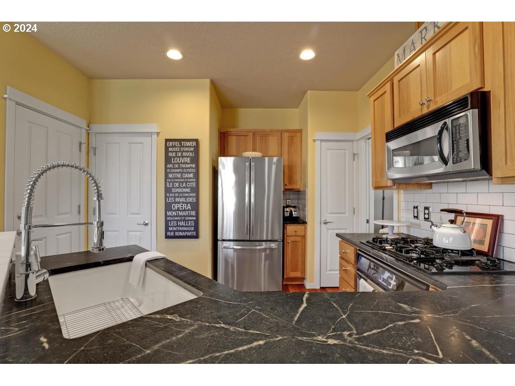 Orenco’s Stonewater. Meticulously updated, light & bright end unit townhome. 1,202 Sq.Ft. 2 bedrooms, 2.5 Bathrooms. Living Room with gas fireplace and hardwood floors flows into the kitchen featuring soapstone countertops, stainless steel appliances and pantry. Eating nook with sliding glass door leads out to the fully fenced patio. Primary suite retreat with sunny corner nook, walk-in closet and bathroom featuring double sinks and walk-in closet. Desirable location within the community next to neighborhood common space. 1 car garage and ample guest parking. Newer high efficiency heating & cooling system, roof and siding. Dream location near Orenco Station shopping, dining and activities. [Home Energy Score = 7. HES Report at rpt.greenbuildingregistry.com/hes/OR10226821]