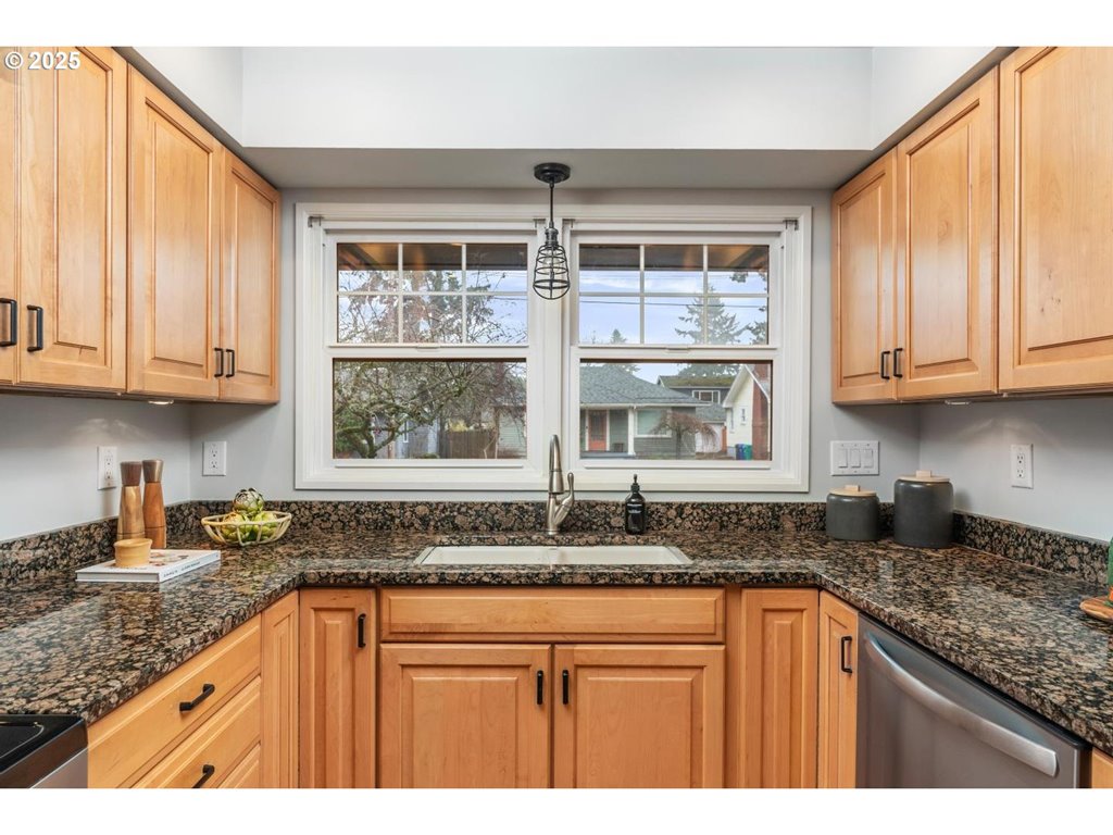 Mid-Century Modern Charm in Arbor Lodge! This stunning home features a comfortable mid-century layout, recently refinished hardwood floors throughout the main level, a cozy fireplace in the living room, and outstanding outdoor space. Enjoy 3 bedrooms on the main floor plus a non-conforming bedroom in the basement. Two full bathrooms, one on each level, offer modern convenience. The updated kitchen shines with granite countertops and new stainless steel appliances. Recent upgrades include a brand new front door (2024), new roof (2021), fresh exterior paint (2021), new A/C (2021), and new wood floors in the kitchen and dining nook (2022). The exterior features cedar shake siding, a covered deck, and a rebuilt back stair (2021). The fully fenced backyard offers privacy with raised garden beds, two productive espalier fruit trees, and a tranquil atmosphere. The lower level features a large family room and a spacious storage/laundry room, full bath, and a 4th non-conforming bedroom (no egress window). The beautifully landscaped front yard, updated in 2020, features a charming seating area/patio, drought-tolerant plants, and a design that attracts hummingbirds and butterflies, creating a vibrant and inviting space. The extra-wide driveway accommodates multiple vehicles, and the drive-through garage provides even more space for work or car storage. Enjoy the outdoors with easy access to the lush green spaces of Arbor Lodge Park and Gammans Park, perfect for leisurely strolls, picnics, and outdoor recreation. Just a short distance to great restaurants on Killingsworth and in Kenton. Less than a mile to Fred Meyer and New Seasons. [Home Energy Score = 4. HES Report at rpt.greenbuildingregistry.com/hes/OR10235273]