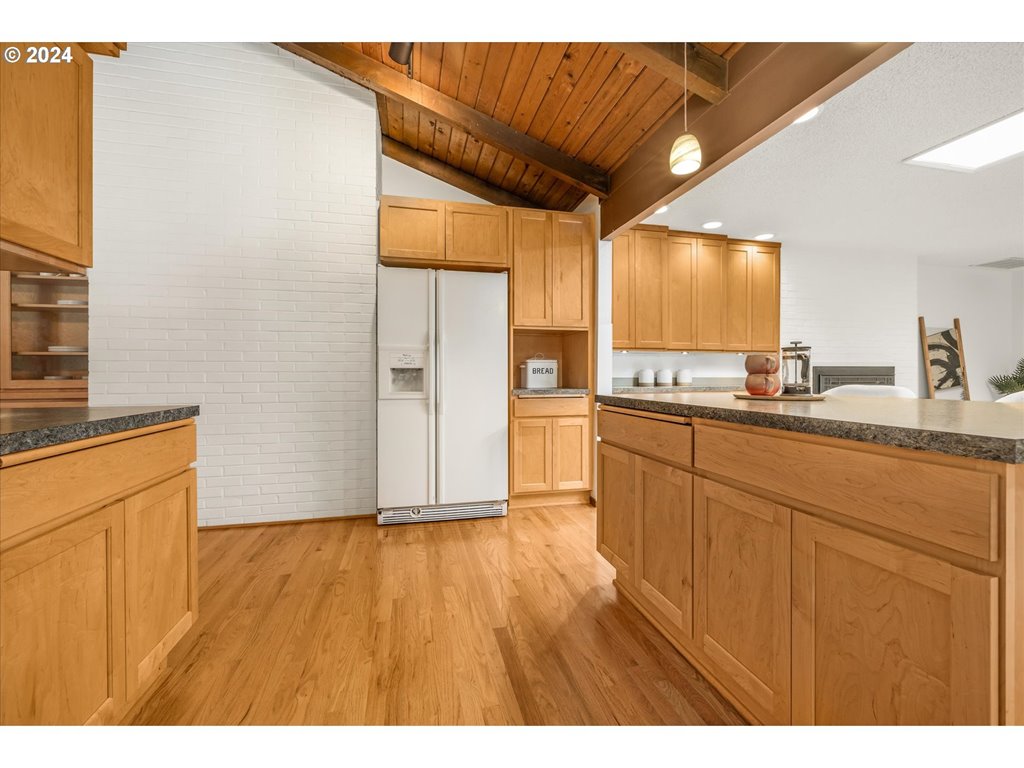 Outstanding one-level home in desirable Pheasant Park neighborhood seamlessly blends NW contemporary design with modern amenities. Majestic vaulted beamed wood ceilings in LR, DR, and kitchen emulate a Sunriver vibe. Low maintenance landscape, no yard to mow, perennial flowering plants, raised beds,drip system and very private fenced back yard with SW exposure ideal for gardening enthusiasts! Living room features a floor to ceiling stone fireplace & ceiling fan, while the light filled family room includes a gas fireplace insert and 2 skylights. Gorgeous oak hardwood floors flow through entry, dining room, kitchen, family room, & hall to bedroom wing. The custom kitchen boasts maple cabinets, multiple pullouts, breadboards & recycle center, 5 burner gas cooktop, double ovens, refrigerator, and an island with eating bar. Laundry room with abundant cabinets, folding counter, LG washer & dryer & convenient 1/2 BA lead to a Flex room, for office, hobbies or smaller BR, set up with fiber optic, bookshelves & closet. The family room, dining, & primary BR open to a huge patio, perfect for outdoor living and entertaining + wired for hot tub. Fence replaced over time, re-stained 2020, 3 gates and a tool/garden shed tucked off a garden path. New interior paint, updated electrical panel, replumbed pex piping, triple pane windows, extra attic insulation. Oversized garage has pull down stairs to attic, workbench, shelves, plus a 220 outlet. Extra parking next to driveway too. Located in the heart of high tech, Intel, Nike, Tektronix & more. Costco, Tanasbourne shops & restaurants abound. Visit the peaceful Nature Park & Interpretive Center, or the Tualatin Park & Rec Center, with tennis courts, parks, and the Aquatic center for all ages with 50 meter pool. Easy commute to Hwy 26 to DT PDX or head to the beautiful Oregon coast to surf, fish, camp, peruse coastal town shops & local art, eat fresh seafood and enjoy spectacular sunsets! This impeccably maintained home beckons you!