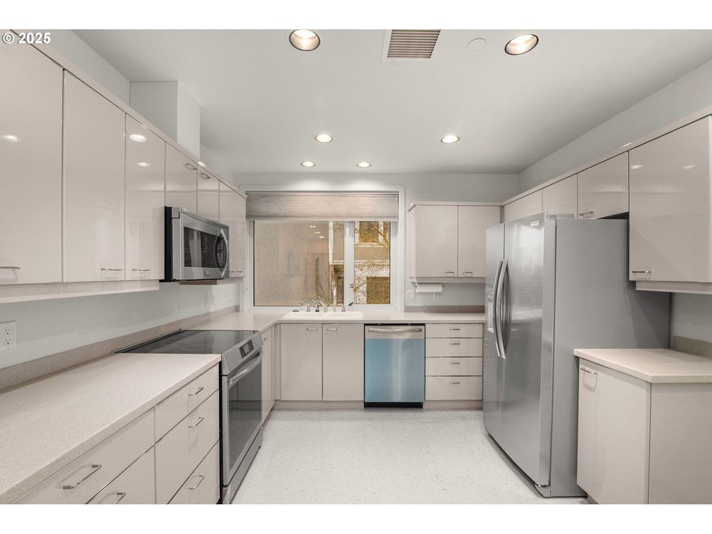 Vista House Condominiums offers the rare union of historic neighborhood charm and the refined ease of modern condominium living. Optimally positioned on the corner and perched three levels above the street, this exceptional residence captures sweeping downtown views by day and a sparkling cityscape by night. A rare formal entry welcomes you with a generous double closet and an art wall, setting the tone for the home’s thoughtful design. The expansive main living area offers remarkable flexibility, anchored by a truly distinctive custom fireplace clad in granite, with ample space for a proper dining area. A large balcony extends the living space outdoors—ideal for entertaining or a garden retreat. The kitchen is light and sunny with a picture window looking out to the city and neighborhood. Planned to be open, the kitchen can easily accommodate an eating or additional cooking area. Rare three bedroom floor plan which includes a primary suite offers great options for use of the space. Two parking and storage room. Walk to Goose Hollow, downtown, Timber games. Transportation is within blocks.