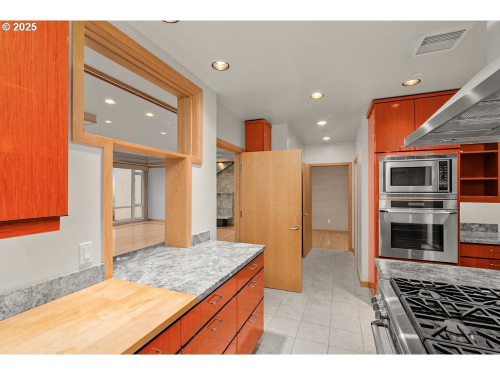 Vista House Condominiums seamlessly blends the charm of a quiet, historic Portland neighborhood with the ease and sophistication of condominium living. Set in coveted Portland Heights, this custom residence is gracefully perched three levels above the street overlooking Goose Hollow, offering wonderful views of the city, mountain and beyond. Gracefully proportioned and beautifully designed, this elegant home presents a rare opportunity for expansive single-level living. Thoughtfully detailed, this custom residence showcases extensive recessed lighting, inlaid hardwood floors, and a gas fireplace with a granite and steel surround. The expansive wraparound balcony provides exceptional outdoor living and entertaining space. Both baths have been refreshed with newly tiled showers. The well-appointed kitchen features granite, stainless high end appliances, custom built-ins, and a serving window designed for ease and flow. The primary suite is privately positioned and offers a substantial walk-in closet with vanity and a spa-inspired bath with a newly tiled shower, marble floors and jacuzzi tub. Second bedroom is located adjacent to the guest bath. Sale includes two assigned parking and large storage room. Walk to Goose Hollow. Timber Stadium and MAX stop.